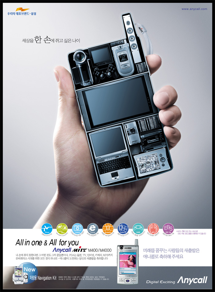 후반 컴퓨터 합성 작업을 통해 만들어진 제품들의 핸드폰 속 배치가 참 재미있습니다.. 카메라 폰 랜즈 위치에는 켐코더가…액정 모니터 위치에는 대형 PDP가… 조작 버튼 위치에 노트북 키보드를…ㅎㅎ  모든 제품의 배치에서 디자이너의 고민한 흔적이 느껴지며 아이디어를 느낄 수 있어서 참 좋았습니다..