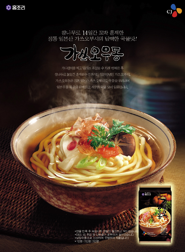 비록 연기가 조금 난다 할지라도 한번의 촬영으로 해결을 할수도 있었지만 이번 경우는..광고주가 < 훈제의 개념이나 분위기, 사용소품들에 대한 확실한 주문을 유보한 상태 > 로 진행을 해야 했기 때문에 추후에 광고주의 다른 주문( 사진의 분위기& 바닥소재의 재질&가스오 부시의 위치나 수량 )이 있을 경우를대비해야 했습니다.. 한 컷에 촬영 했을 경우 사진의 내용을 바꾸기가 몹시 힘들어지기 때문에 각각의 여러 소스들을 각각 여러 다른 종류별로 촬영을 해놓게 된것 입니다…. 문제는 우동!… < 우동의 조리된 모습은 세상에서 가장 맛있어 보이게 찍어야 한다?.. >라는 조건은 참 부담스럽더군요… 광고주는 포장지에 인쇄된 우동 사진 보다 훨씬 좋은것(?)을 바라고 있었 습니다만… 제가 볼땐 그 사진.. 솔찍히 그냥 이번 광고에 사용해도 좋을만큼 훌륭한 사진 이었 습니다..^^