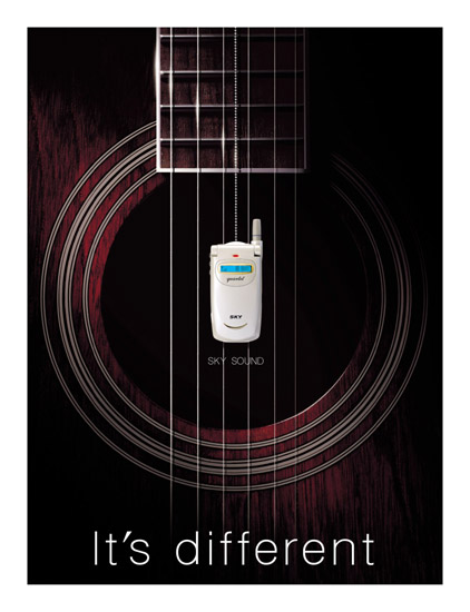 sky 는 삼성 에니콜과 더불어 우리나라 핸드폰 시장을 리드 하고 있는 대표 브렌드 중 하나 입니다. ” it’s different ” 라는 타이틀로 시작된 sky 시리즈는 간결 하면서도 강한 메시지를 전달해주는 마음에 드는 광고중 하나 이죠. 한참 핸드폰 예절이 도마에 올랐던 시절..16화음 이상의 음질을 강조하는 sky제품의 제품컨셉이 염려되는 부분도 있었지만 결국 엄청난 히트를 기록하며 인기를 끌게 되더군요. 요즘도 저는 구형 mp3폰을 가지고 다니지만.. 늘 벨소리에 기가 죽게 되는군요^-^